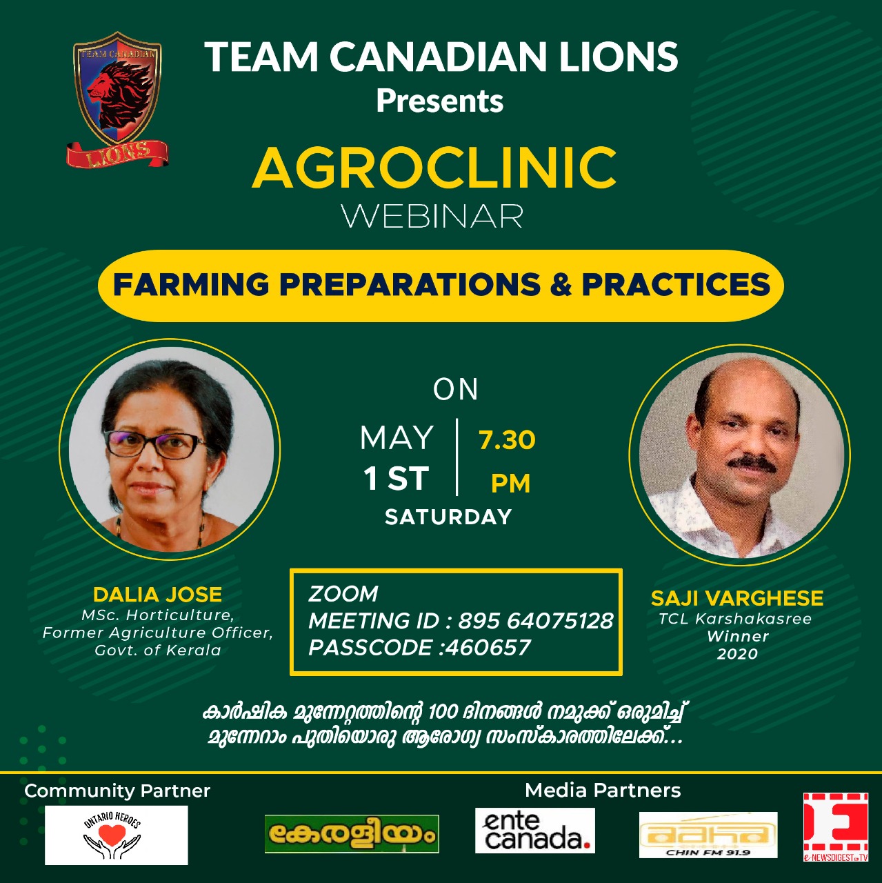 കാർഷികസംസ്കൃതിയിലുടെകനേഡിയൻമലയാളികൾക്കിടയിൽപരസ്പരസഹകരണംവർധിപ്പിക്കാനുംഉപയോഗശേഷംഅധികംവരുന്നകാർഷികോല്പന്നങ്ങൾആവശ്യക്കാർക്കുപരസ്പരംകൈമാറാനുളളഒരുവേദിയുമാണ്അഗ്രോക്ലിനിക് .മെയ്മുതൽസെപ്റ്റംബർവരെയുള്ളസമയത്തിനുള്ളിൽഅനുകൂലമായകാലാവസ്ഥപ്രയോജനപ്പെടുത്തികൊണ്ട്എങ്ങനെവീട്ടാവശ്യത്തിനുള്ളപച്ചക്കറിലാഭകരമായിഉൽപ്പാദിപ്പിക്കാംഎന്ന്മനസിലാക്കാനുംപഠിക്കാനുമുള്ളഅവസരമാണ്ലയൺസ്അഗ്രോക്ലിനിക്കിലൂടെകൈവരുന്നത് .
